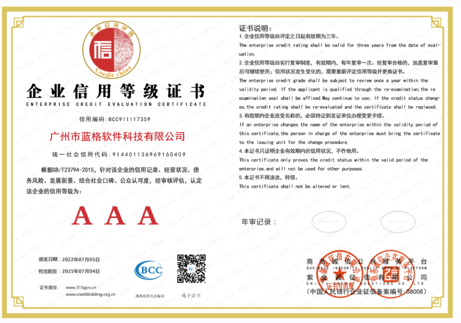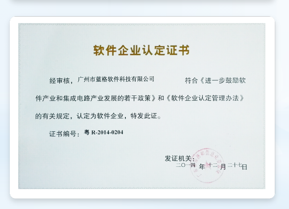 連續(xù)3屆9年,獲得國家“高新技術(shù)企業(yè)證書”;獲得“中國軟件行業(yè)信用等級AAA”證書;累計獲得36項軟著證書。