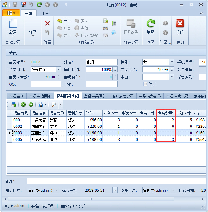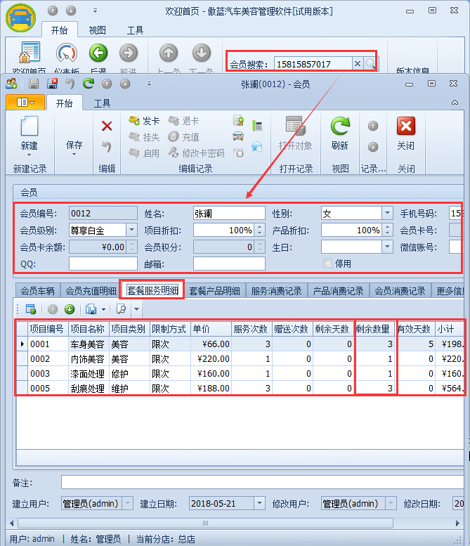 汽車美容店的會員到店消費(fèi)已購買的套餐服務(wù),店員根據(jù)會員提供提供的電話號碼或姓名,在傲藍(lán)汽車美容軟件的搜索欄中快速搜索出會員資料,查看會員資料中剩余可以用的套餐服務(wù)次數(shù),如圖: