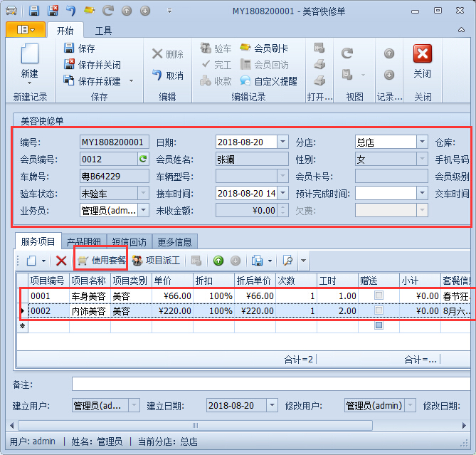 ②為會員開完美容快修單并使用套餐內(nèi)的服務(wù),軟件將自動扣減服務(wù)數(shù)量,如圖: