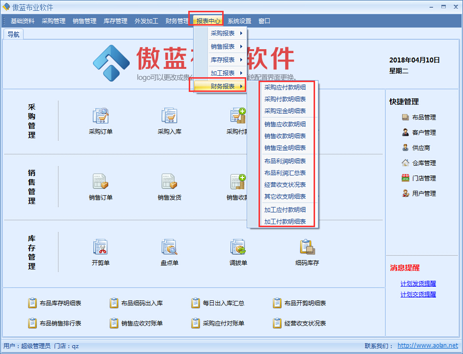 在傲藍(lán)布匹銷售管理軟件的財(cái)務(wù)管理模塊中做了很多財(cái)務(wù)管理的各種明細(xì)報(bào)表,比如:采購應(yīng)付款明細(xì)、采購付款明細(xì)表、供應(yīng)商訂金流水、銷售應(yīng)收款明細(xì)、銷售收款明細(xì)表、客戶訂金流水賬、經(jīng)營收支狀況表、其他收支明細(xì)表、加工應(yīng)付款明細(xì)、加工付款明細(xì)表;詳細(xì)的財(cái)務(wù)報(bào)表中心,通過各個(gè)財(cái)務(wù)明細(xì)報(bào)表了解客戶或供應(yīng)商的收費(fèi)情況及店鋪經(jīng)營的數(shù)據(jù)報(bào)表。