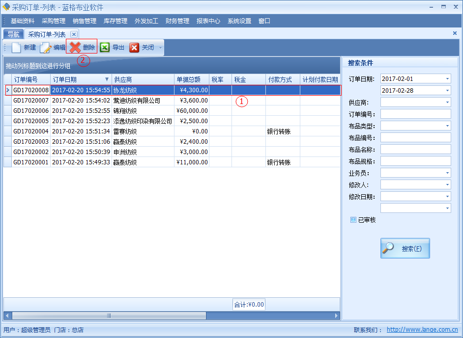 如需要對(duì)采購(gòu)訂單中某一條數(shù)據(jù)進(jìn)行刪除的,通過(guò)采購(gòu)訂單列表選中一條記錄點(diǎn)擊【刪除】按鈕,刪