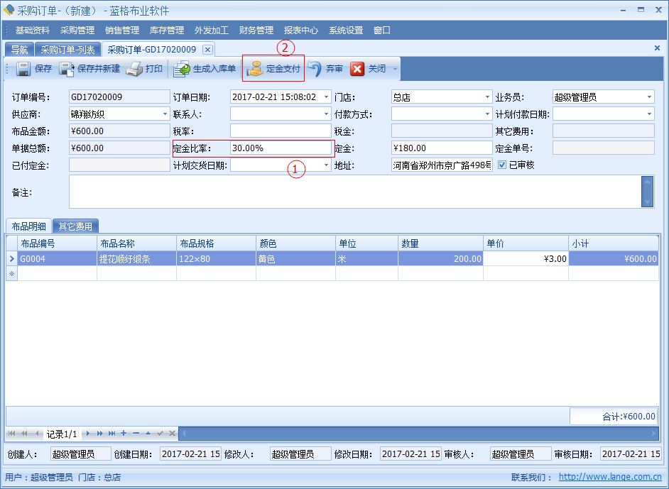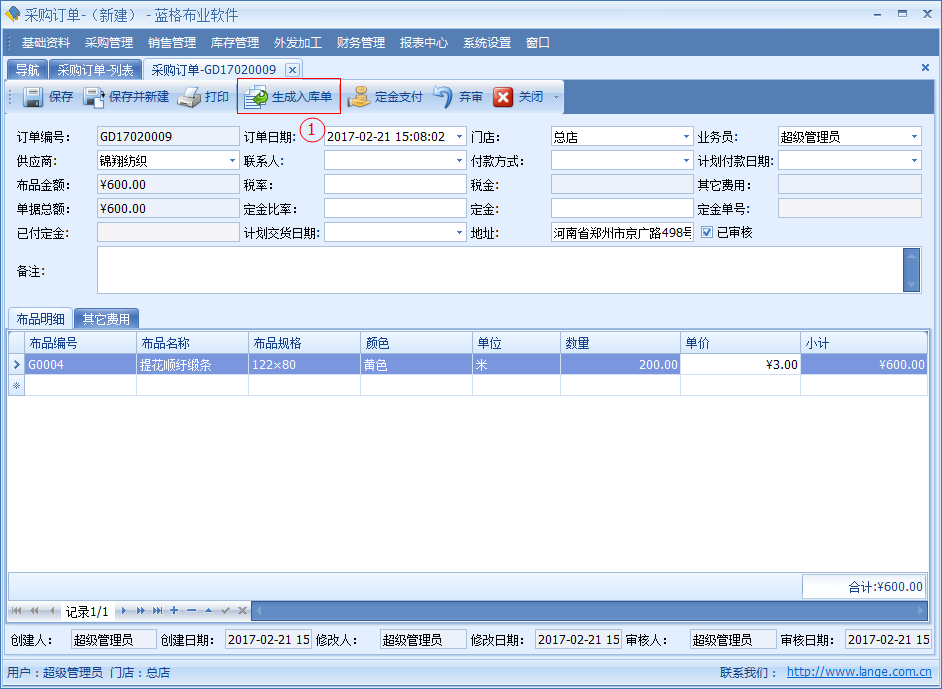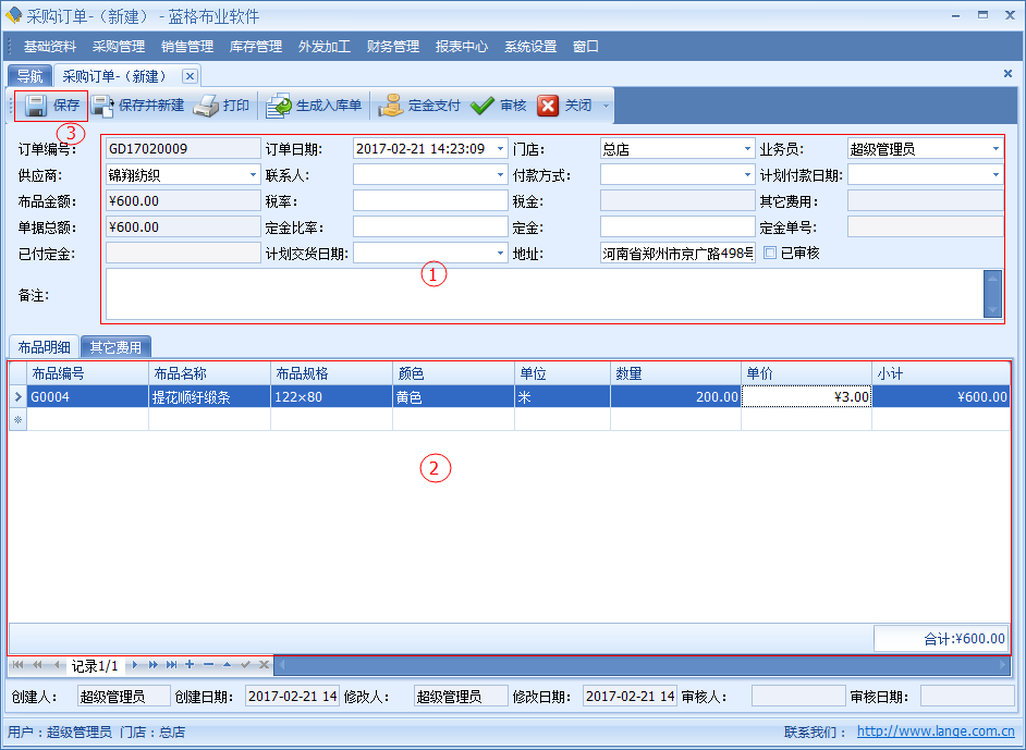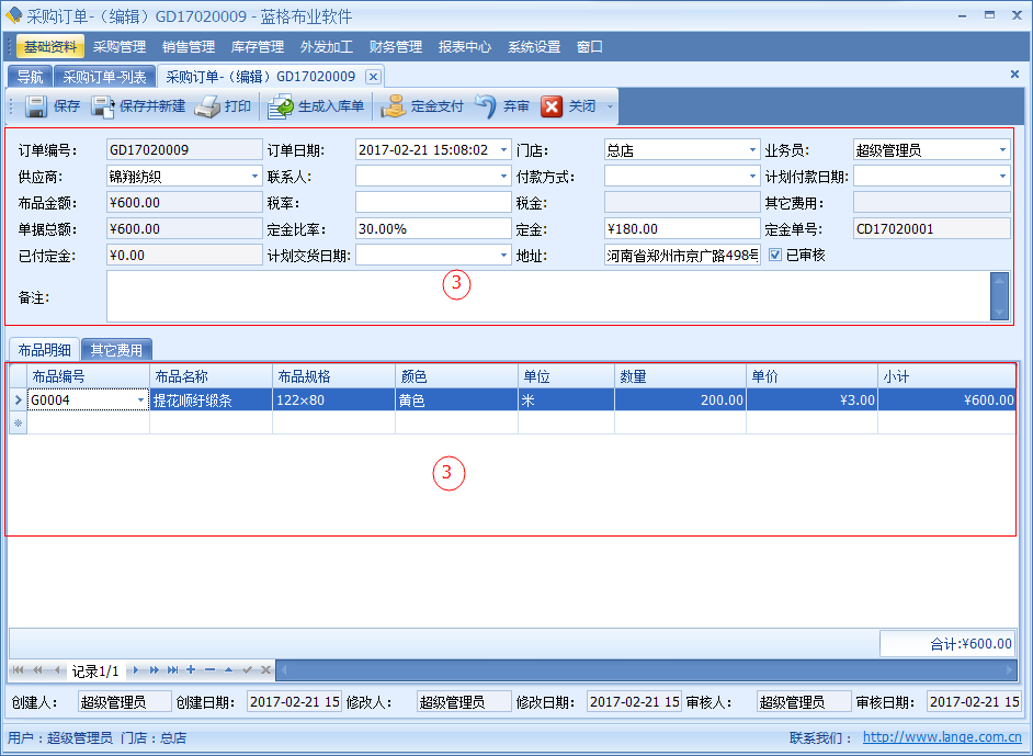【采購(gòu)訂單】中記錄了開(kāi)單日期、供應(yīng)商、供應(yīng)商聯(lián)系人、交貨日期、付款日期、付款方式、金額、定金、稅率、稅金等信息。明細(xì)數(shù)據(jù)中是該單據(jù)采購(gòu)布品名稱,顏色,單位,數(shù)量?jī)r(jià)格等詳細(xì)數(shù)據(jù)。