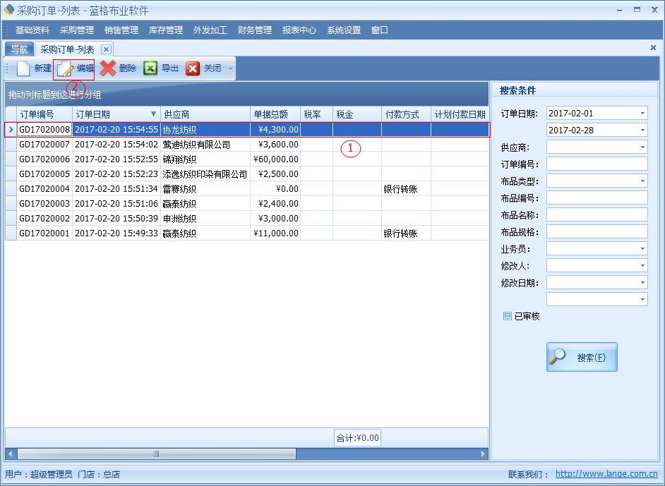 ○1 通過(guò)訂單編號(hào)或者供應(yīng)商,布品名稱等方式快速查詢數(shù)據(jù)。 如下圖: