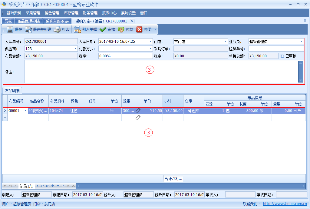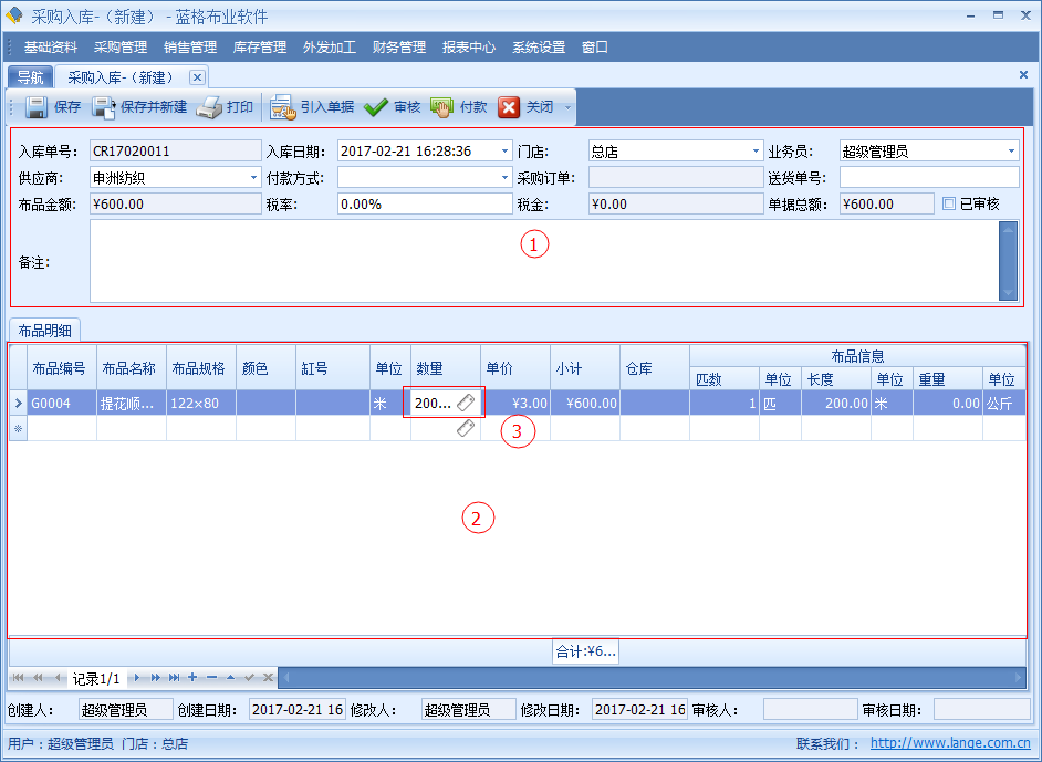 傲藍(lán)布行管理系統(tǒng),主要是對采購回來的布品,進行錄入入庫。【采購入庫】單具體中記錄了采購布匹的單據(jù)日期、引用采購單據(jù)編號、供應(yīng)商、送貨單、入庫的倉庫、單據(jù)總金額、稅率、稅金等信息。明細(xì)列表中包括單據(jù)采購布品名稱,顏色,單位,數(shù)量價格等詳細(xì)數(shù)據(jù)。