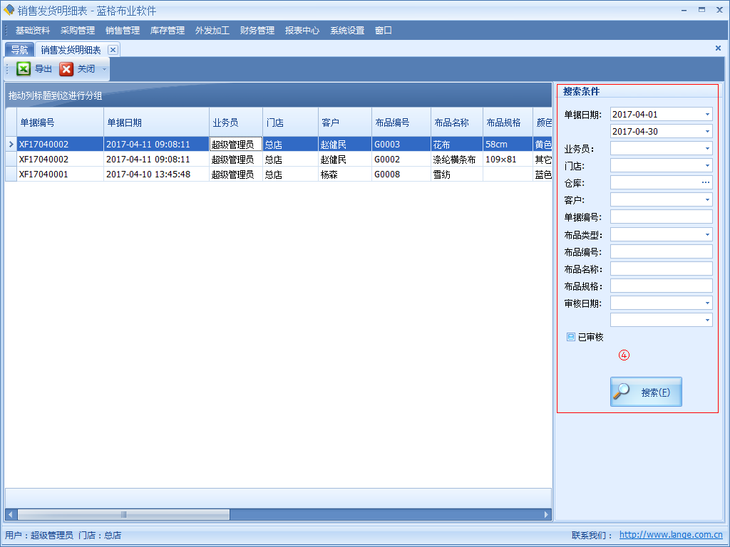 傲藍(lán)布業(yè)軟件銷售發(fā)貨明細(xì)表:記錄所有的銷售發(fā)貨記錄。在表中詳細(xì)記錄了銷售日期,業(yè)務(wù)員,門店,客戶,布品編號(hào),布品名稱,布品規(guī)格,顏色,單價(jià),數(shù)量,售出總價(jià)等信息。