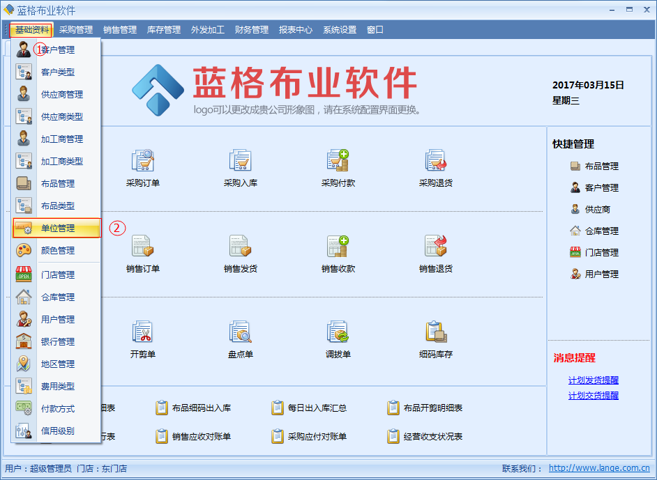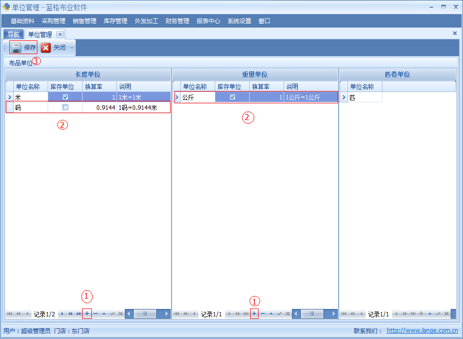 傲藍(lán)布業(yè)銷售軟件,單位管理分長(zhǎng)度單位,重量單位,匹卷單位。單位管理是是布品信息里的一個(gè)字段信息,每一個(gè)布品信息只可以選擇一個(gè)單位,單位的內(nèi)容包括:?jiǎn)挝幻Q、是否是庫(kù)存單位、單位比率。