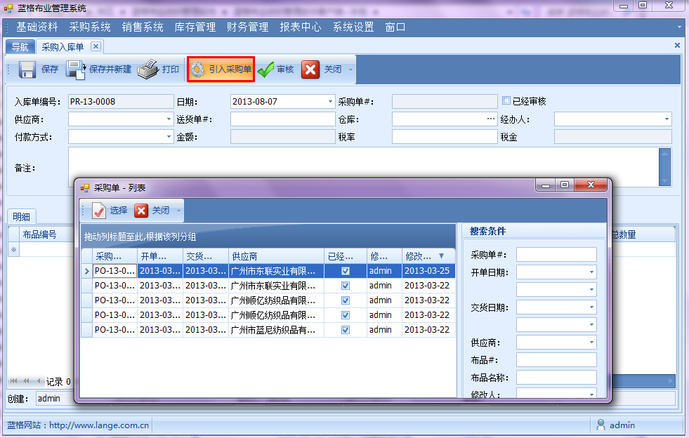 在傲藍布業(yè)管理系統(tǒng)各個子系統(tǒng)層次分明,流程式的操作簡單而且方便。如采購系統(tǒng)包括采購訂單,采購入庫,采購?fù)素?,采購付款四個子功能。銷售系統(tǒng)包括銷售報價單,銷售訂單,銷售發(fā)貨,銷售退貨,銷售應(yīng)收五個功能。各個子系統(tǒng)中功能操作簡單并且可以直接引入上一個功能的數(shù)據(jù)。如采購入庫就可以導(dǎo)入采購訂單中的數(shù)據(jù),采購?fù)素浛梢詫?dǎo)入采購入庫的數(shù)據(jù),這樣不僅減少了錄入操作,還把各單據(jù)關(guān)聯(lián)起來。如圖: