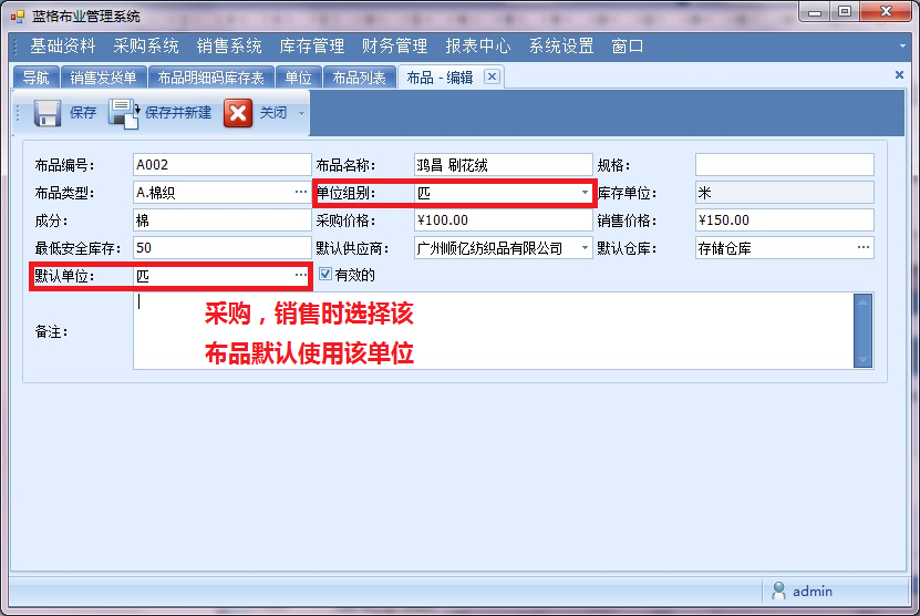 在【基礎(chǔ)資料】【布品】里設(shè)置布匹的單位。