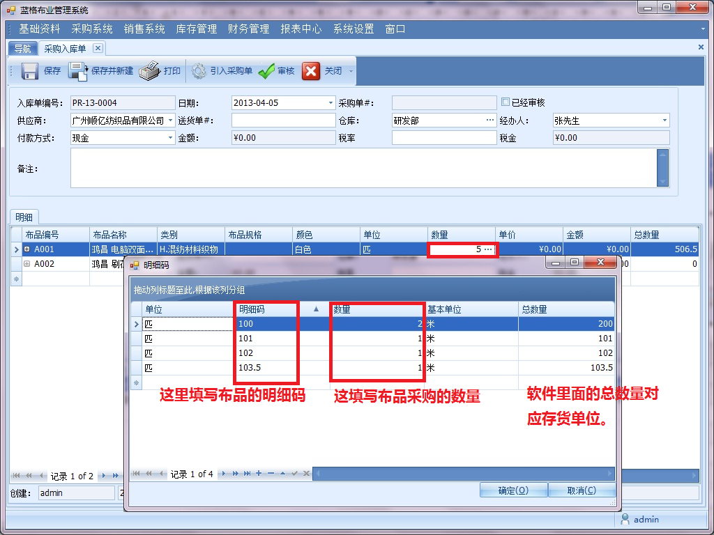 采購進貨時錄入布匹明細(xì)碼以及該明細(xì)碼進貨的數(shù)量,系統(tǒng)自動計算庫存單位數(shù)量并核算整匹的匹數(shù)量。軟件中清楚的顯示當(dāng)前進貨布匹的匹數(shù)和米數(shù)。