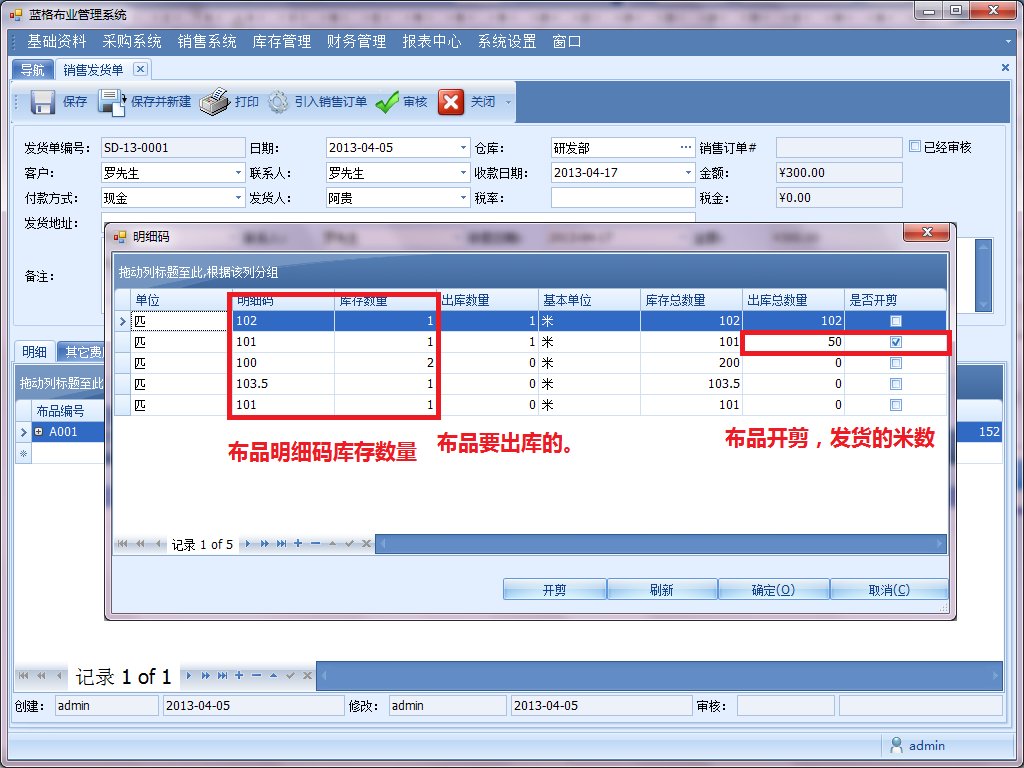 商品銷售時,系統(tǒng)可以進行開剪業(yè)務(wù), 在開剪業(yè)務(wù)時系統(tǒng)會先拆分該明細(xì)碼的數(shù)量為1然后就可以填寫要銷售的數(shù)量。在這里可以清楚的知道當(dāng)前銷售布匹的明細(xì)碼匹數(shù)以及是否開剪,當(dāng)開剪時剩下的將產(chǎn)生另外一個明細(xì)碼布匹。這會在報表里和以后出庫現(xiàn)在布匹時體現(xiàn)出來。