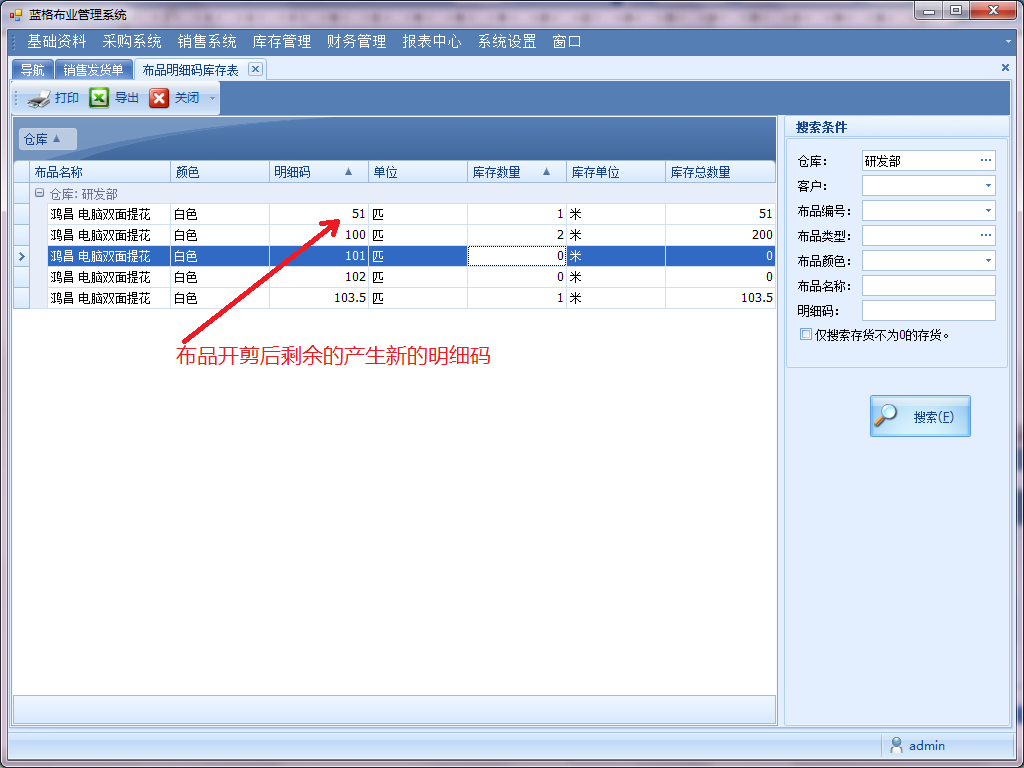 報表中心可以實時查詢到當(dāng)前布匹明細(xì)碼的庫存數(shù)量。這里可以看到開單銷售時開剪剩下的布匹。