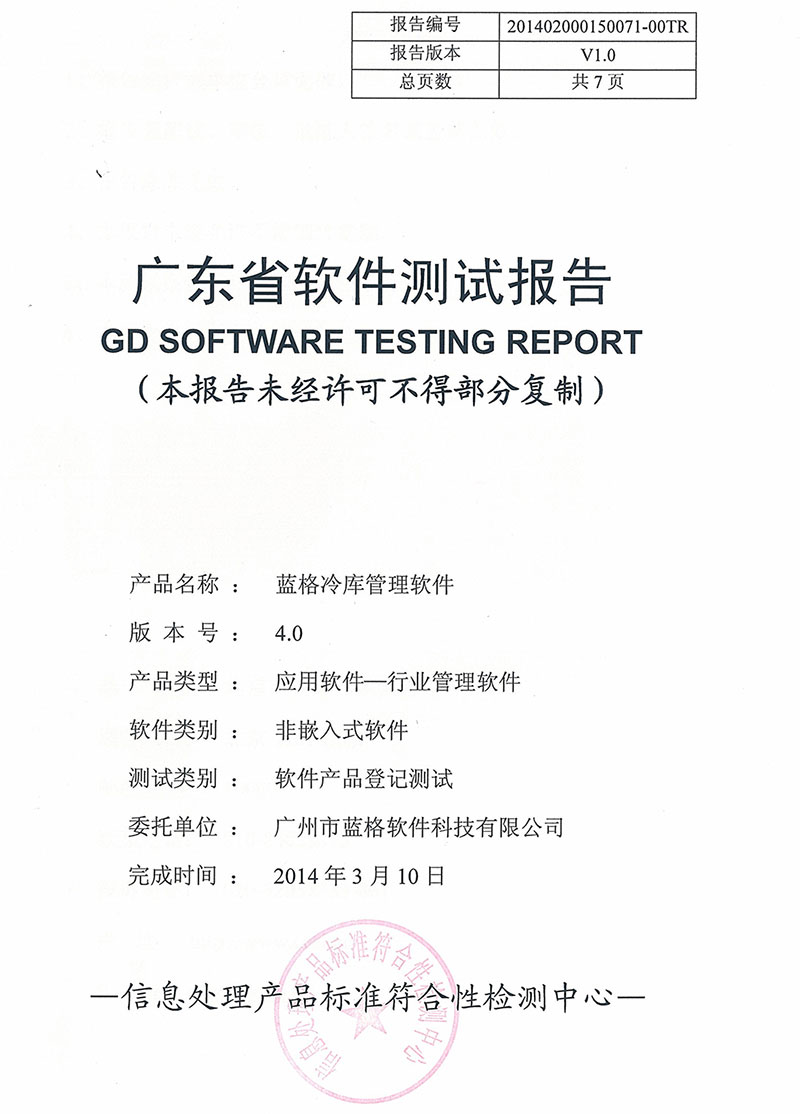 傲藍冷庫管理軟件產品登記證書