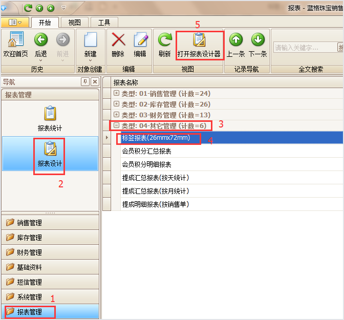 首先我們要準備一下標簽模板,可以把傲藍珠寶銷售管理軟件中自帶的標簽報表從軟件中導出,操作如下:點擊1【報表中心】--2【報表設計】--3【其它管理】--4選擇【標簽報表(26mmx72mm)】---5點擊【打開報表設計器】,如圖所示: