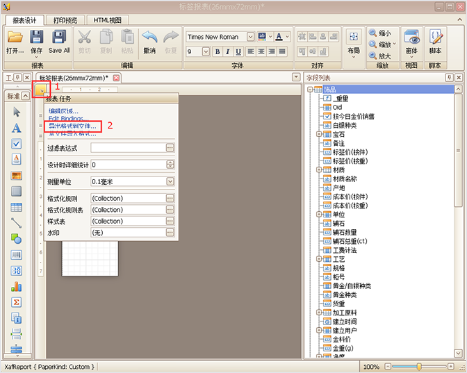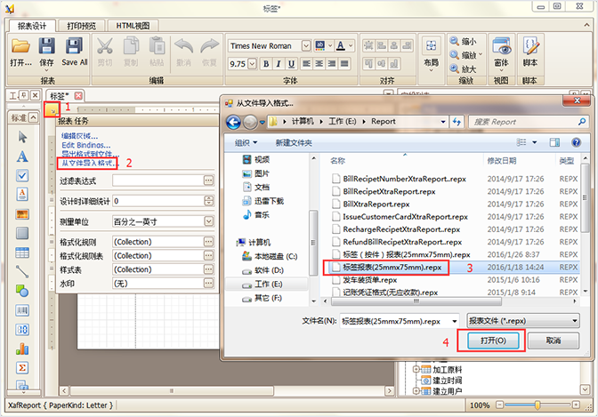在新建的編輯窗的左上角1點擊設計珠寶標簽模板,珠寶銷售管理軟件按鍵彈出導入與導出的功能窗,2選擇【從文件導入格式...】--3選擇文件存放的位置并選擇導入的文件(報表的文件格式為:repx格式),4點擊打開即可導入報表。如圖所示: