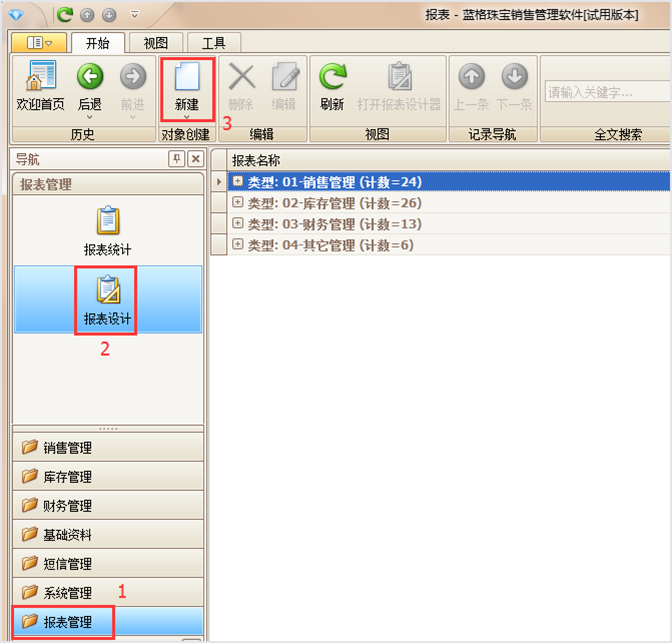 操作如下:點擊1【報表中心】--2【報表設計】--選擇3【新建】如下圖所示: