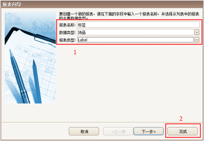 彈出【報表向導】,1在向導中【報表名稱】可以隨意填寫,【數(shù)據(jù)類型】選擇【飾品】,【報表類型】選擇【Label】,2選擇完后可以點擊【完成】。