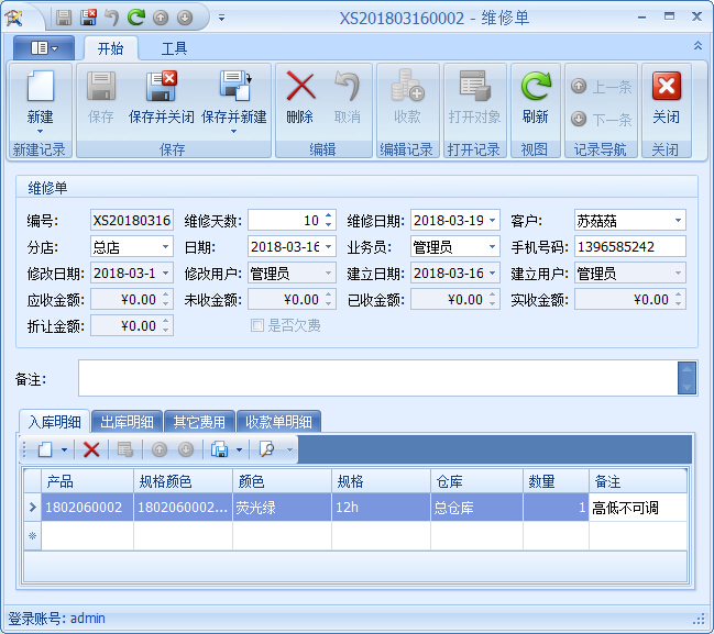 將需要維修的產品都入庫,維修好就可以出庫了,期間產生的費用可以點擊其它費用進行添加。如圖: