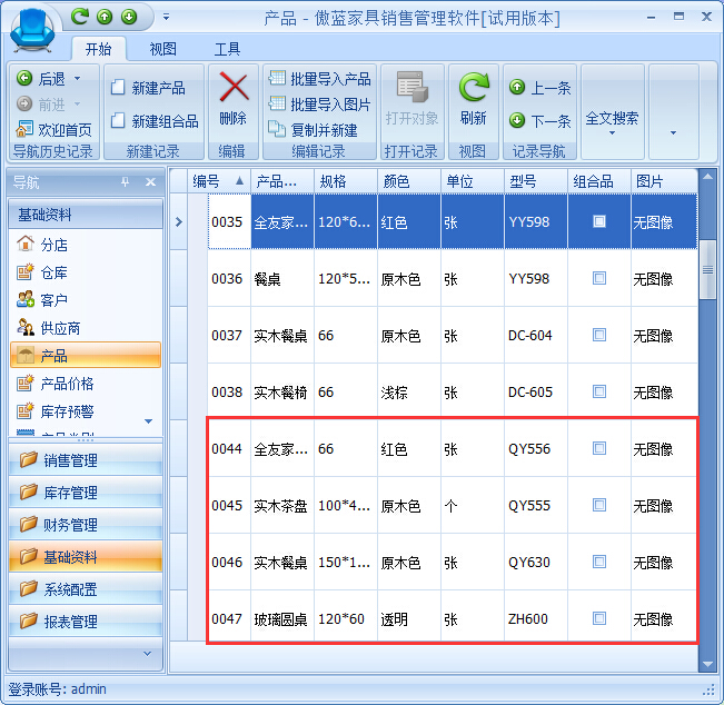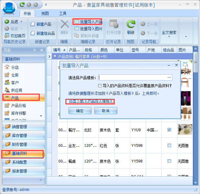 ⑤導(dǎo)入完成之后,傲藍(lán)家具店鋪收銀系統(tǒng)就會在產(chǎn)品資料中新增導(dǎo)入的產(chǎn)品,如圖:
