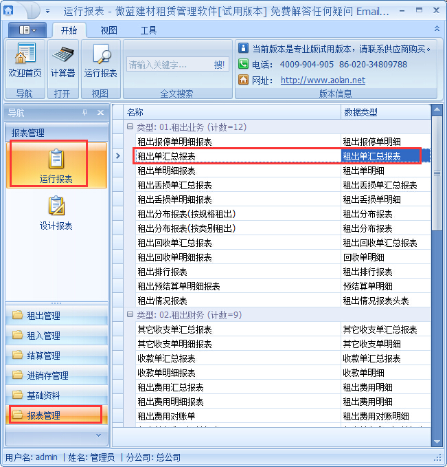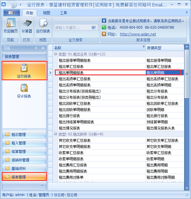 點擊【報表管理】→【運行報表】→租出業務→租出單明細報表: