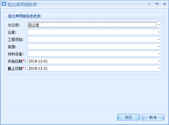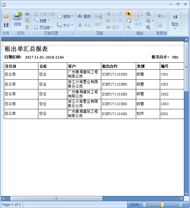租出單匯總表:通過篩選條件,根據所需要的情況選擇需要查看的租出匯總: