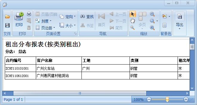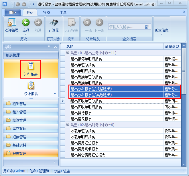 進入傲藍鋼管租賃管理軟件,在左邊導航欄上選擇“報表管理”,然后點擊運行報表,在右邊窗口找到“租出分布報表(按類別租出)”和“租出分布報表(按規格租出)”如下圖: