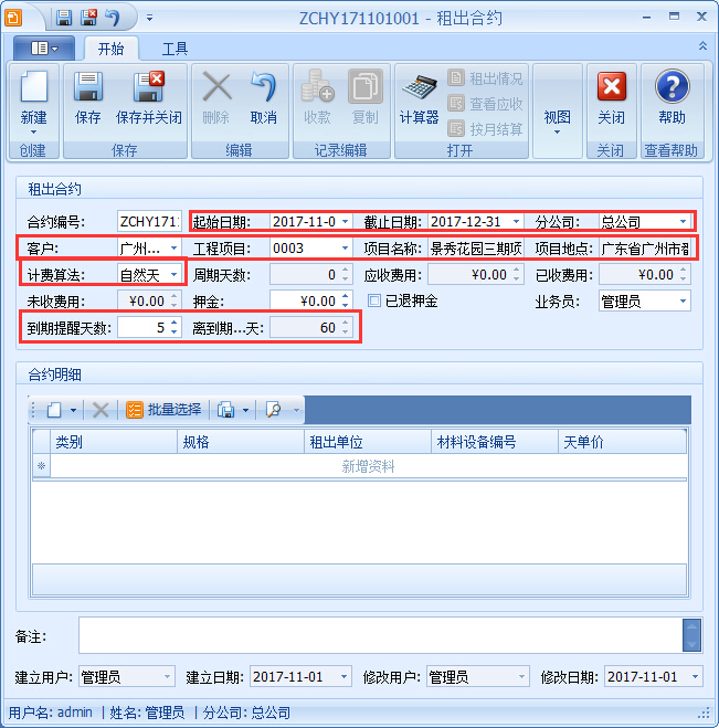 1、點擊【租出管理】→【租出合約】→【新建】租出合約單,確定起始日期,客戶,選擇工程項目,選擇租賃站與客戶商定的計費算法;軟件支持設置合約到期提醒,提醒租賃站工作人員跟進該項合約情況,與客戶協(xié)商后期租賃事項,是否延長合約的期限,如圖: