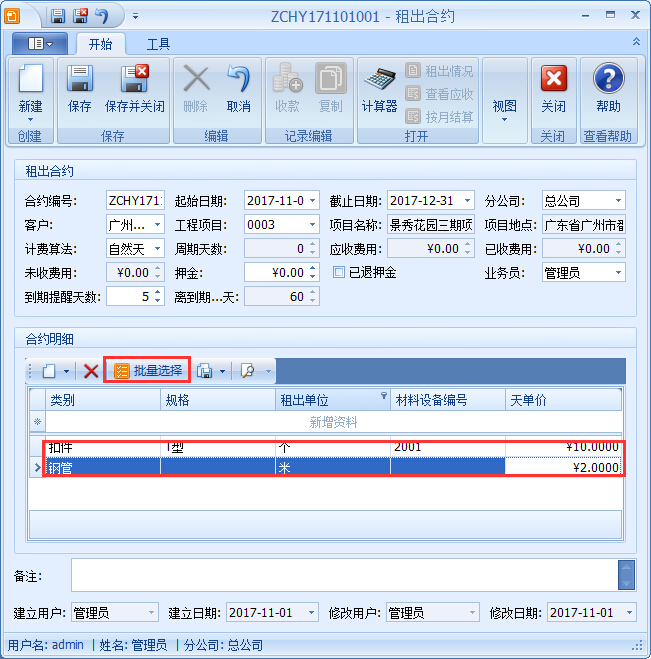 ①在合約明細中確定客戶本次工程項目中需要租賃的材料,支持批量選擇,減少重復選擇材料,提高租賃站的工作效率,在材料明細中填入商榷好的租賃單價,保存即可完成合約租賃,如圖: