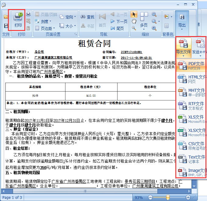 3、租出合同詳細情況查詢,點擊菜單欄的“視圖”“顯示報表”“租出合約”查看租出合約的詳細情況,軟件還支持快速打印或多種文件格式導出租賃合同,如圖: