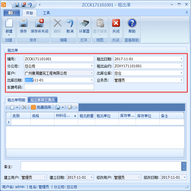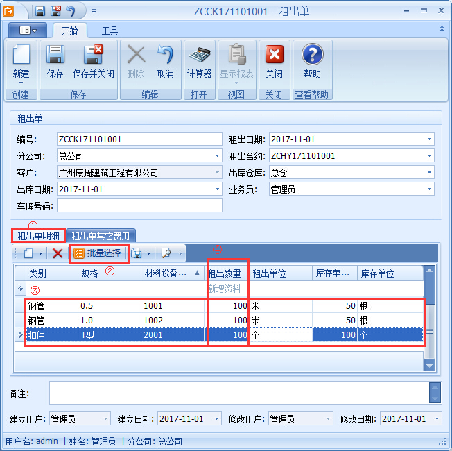 傲藍建筑租賃管理軟件租出單管理的具體操作步驟: