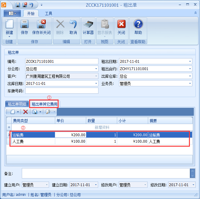 ②若租賃需要租賃站提供運輸或其他裝卸材料的人工,可以“租出單其它費用”中填寫,確定本次租賃需要的其他雜費,如圖:
