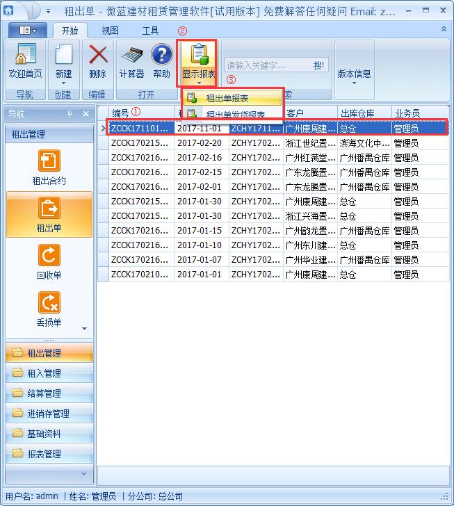 2、如需查看租出單的明細報表,可以在傲藍建筑租賃管理軟件租出單列表中,選中需要查看的租出單,點擊菜單欄的“顯示報表”查看租出單報表以及租出單發貨明細報表,如圖: