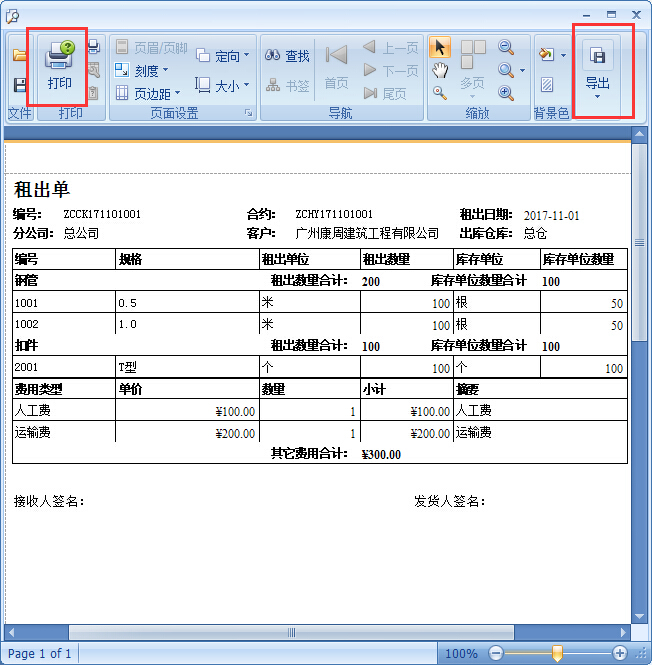 ①傲藍建筑租賃管理軟件還支持將租出單報表快速打印,并導出存檔,如圖: