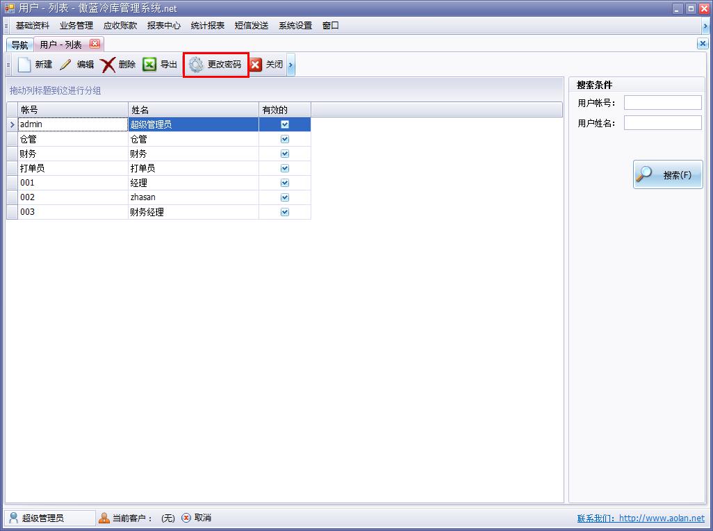 例如,系統的個別用戶離職,為了保障不必要的數據流失,或者避免惡意破壞冷庫管理軟件數據的情況出現,管理員可修改此離職用戶的登錄密碼,性禁止此用戶登錄系統。