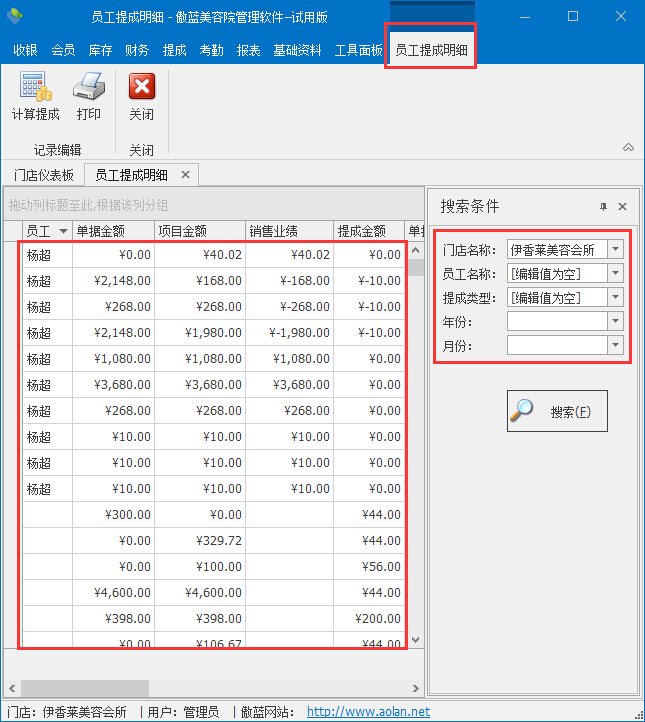 美容院管理系統支持分不同的門店、員工名稱、提成類型、年份、月份來搜索更加細分的員工提成明細。