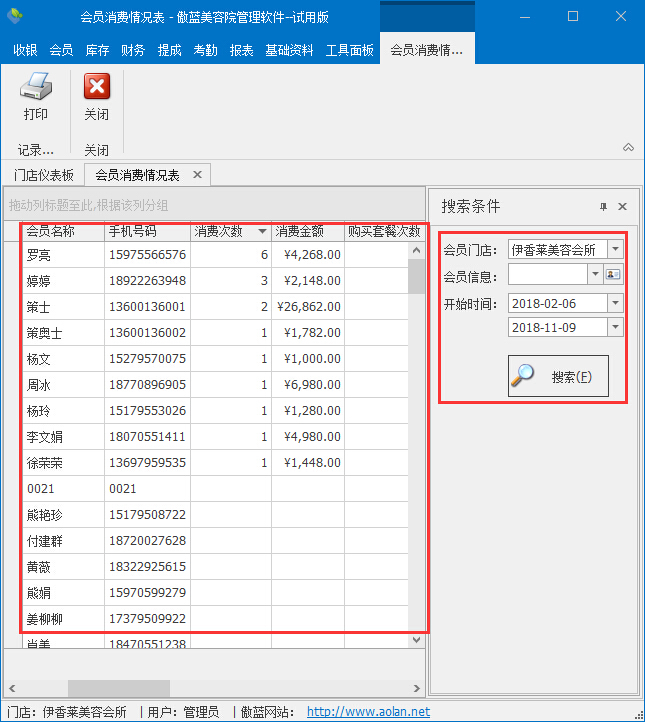 會員消費(fèi)情況表清晰記錄會員在某段時間(搜索時間)內(nèi)會員到店消費(fèi)的情況報表,為美容院提供了快速了解會員的再次購買的次數(shù),購買套餐的次數(shù),總的消費(fèi)金額等。