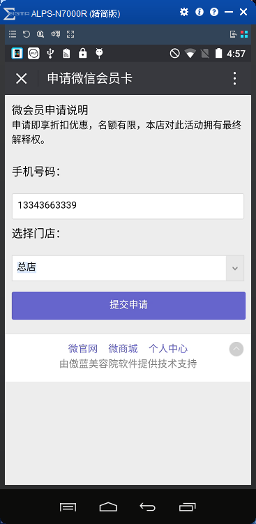 ③申請微信會員卡的具體操作,輸入手機號碼,選擇需要所屬門店,點擊“提交申請”即可,如圖:
