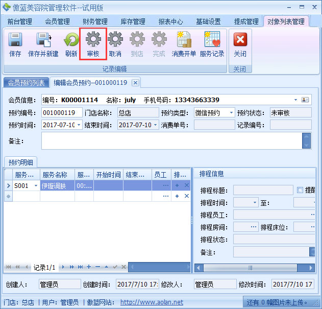 ②會員在微信公眾號預約之后,美容院的工作人員可在門店的傲藍美容院微信會員系統中根據預約提醒,進入預約列表,根據會員在預約單進行合理的工作安排,如圖:
