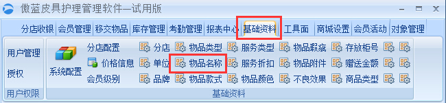 1、打開傲藍皮具護理店管理軟件點擊導航欄的【基礎資料】→【物品名稱】如圖: