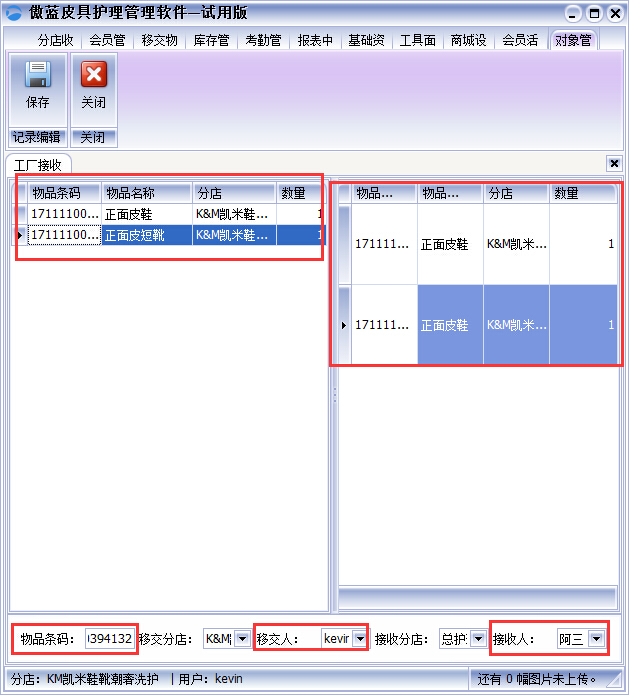 ①工廠接收”工廠接收到門店送來的皮革物品,在軟件“工廠接收”界面,掃描皮革物品的條碼進(jìn)行接收皮革物品,通過傲藍(lán)皮具修理店收銀軟件左右兩個(gè)列表,可以很清晰的看出哪些皮革物品接收,哪些皮革物品未接收或漏接收,確認(rèn)好接收人,保存即可,如圖: