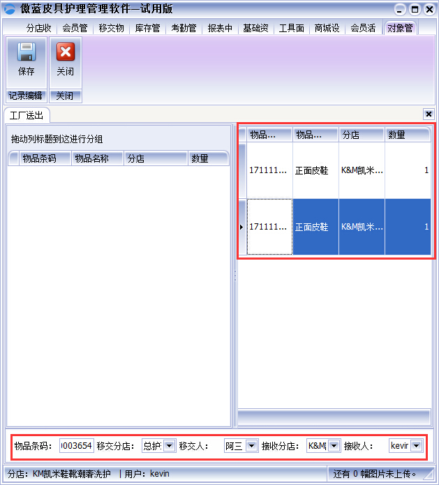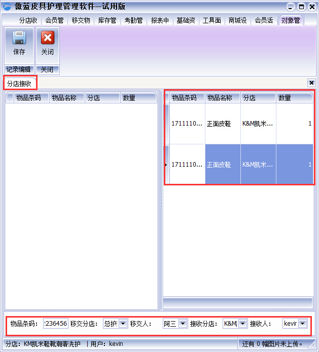 ③“分店接收”操作如上。傲藍(lán)皮革護(hù)理店管理軟件整個(gè)皮革物品移交流程,無需人工清點(diǎn),提高皮革護(hù)理店工作效率,還有效的避免了多次移交可能出現(xiàn)的皮革物品丟失或錯(cuò)送、漏送的情況,如圖: