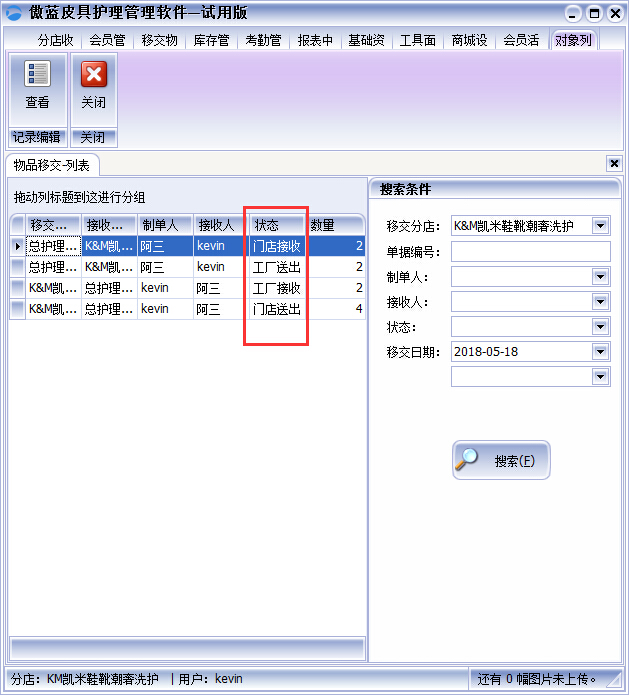 ④皮革物品移交流程完成之后,還可以在傲藍(lán)皮具修理店收銀軟件中【移交皮革物品】→【移交記錄】中的皮革物品移交列表中可以清晰的看到門店和工廠的皮革物品數(shù)量,皮革物品移交的當(dāng)前狀態(tài),有多少皮革物品已經(jīng)洗好移交,還有多少在工廠皮革護(hù)理,使皮革護(hù)理店務(wù)管理更加簡(jiǎn)潔清晰。皮革物品移交列表如圖: