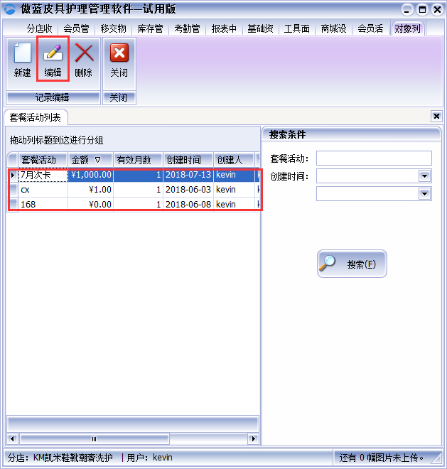 ①設置好的套餐活動可以在套餐活動類別中看到,如果某項套餐活動需要修改可以在列表中選中套餐,點擊“編輯”即可進行對該項套餐活動進行修改,如圖: