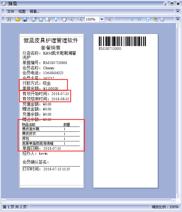 ②軟件還支持打印套餐銷售的小票給客戶,讓客戶可以清晰查看套餐的費用、套餐結束時間、護理物品的具體數量,如圖: