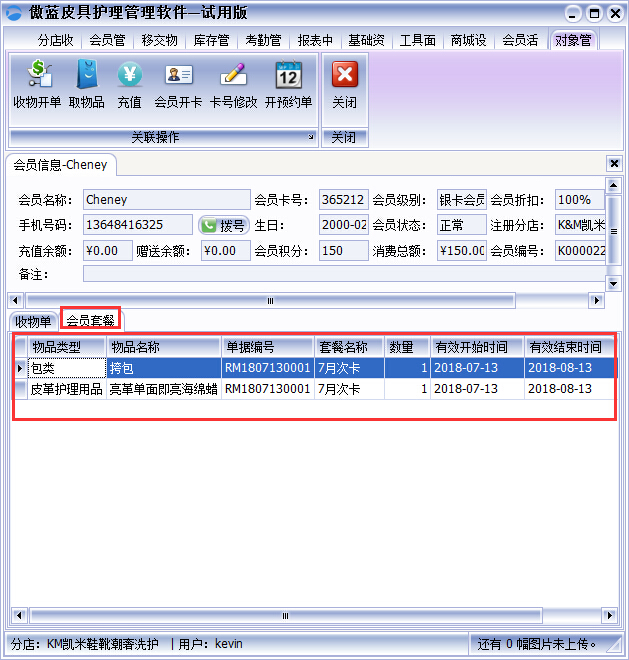 1、點(diǎn)擊軟件界面中的【分店收銀】→【收物開單】為客戶開收物單,不同于其他的散客開單,購(gòu)買了套餐的客戶,在開單界面點(diǎn)擊“選擇套餐”在套餐中選擇本次需要清洗護(hù)理的皮具物品,如圖: