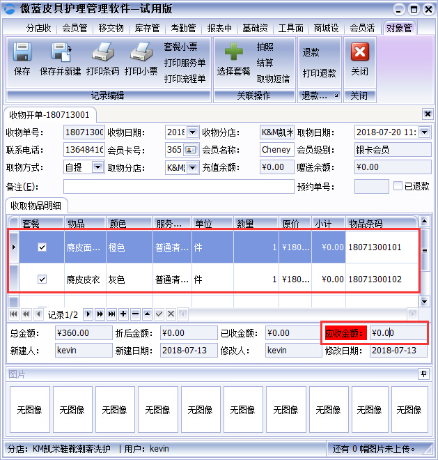 ①選擇套餐中的物品之后,可以在收物開單中再次確認(rèn)本次清洗護(hù)理的物品是否有誤,軟件會(huì)自動(dòng)在套餐中扣減套餐內(nèi)的相應(yīng)衣物數(shù)量,另外,還可以在單據(jù)中看到“應(yīng)收金額為0”證明此次開單消費(fèi)是屬于套餐消費(fèi),會(huì)員已付款。如圖: