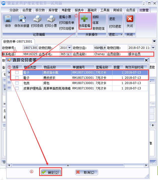 店員在傲藍(lán)皮具護(hù)理店系統(tǒng)給會(huì)員開單消費(fèi)的具體操作步驟: