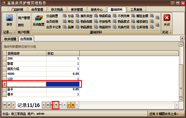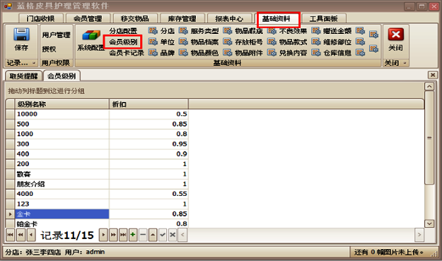 門店一般會為客戶建立會員資料,對于長期固定的客戶我們會給一定的折扣,這時就需要為這些客戶定一個折扣的級別,我們就在皮具護理管理軟件基礎資料內的會員級別里設置,如下圖: