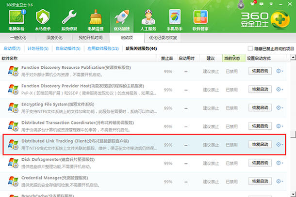 1、電腦安裝了360安全衛(wèi)士,360優(yōu)化加速有一個分布式鏈接跟蹤客戶端,是用來斷絕外面數(shù)據(jù)的傳入;可以選擇“優(yōu)化加速”中的啟動項——接著找到“分布式傳輸協(xié)調(diào)服務(wù)”——主要是看下此項目是否啟動。禁用的話就要在右邊點擊“恢復(fù)啟動”,“已禁用”,點恢復(fù)啟動。這一步完成了還不能完全把問題解決了360一鍵優(yōu)化也會直接影響到電腦系統(tǒng)里面的分布式協(xié)調(diào)器的運行。