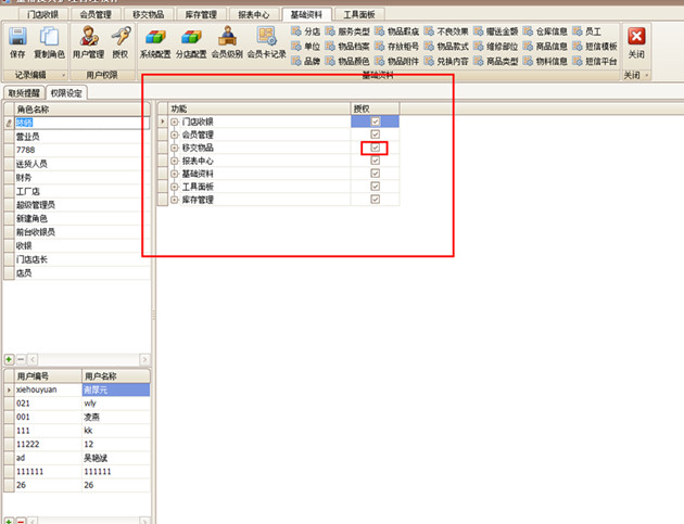 角色添加好后就能給相應的角色設置權限,讓每個角色只操作自己相應的系統功能。選中角色,在右邊的對話框的授權里打鉤,角色就能操作相應的系統功能,如下圖所示: