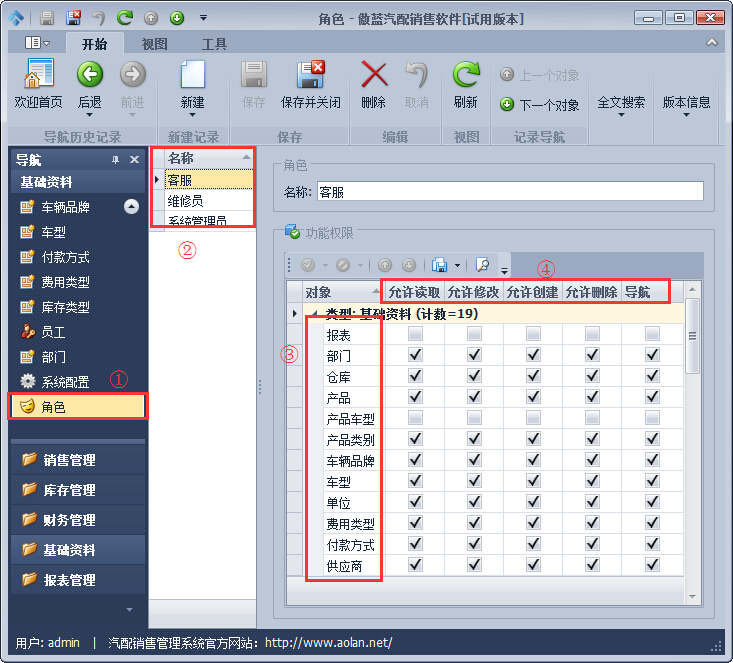 傲藍(lán)汽車配件銷售軟件利用角色權(quán)限功能,精準(zhǔn)的劃分各個部門和崗位員工使用軟件的權(quán)限,確保軟件系統(tǒng)中的數(shù)據(jù)信息的安全性。